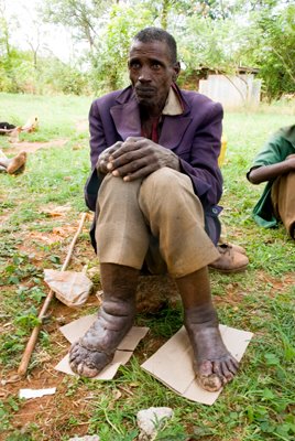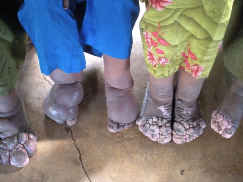 thing is true for a foot disease called podoconiosis, a form of elephantiasis or swelling of the lower leg triggered by prolonged exposure to irritant minerals in red clay soils (ᔥPodo.org).
