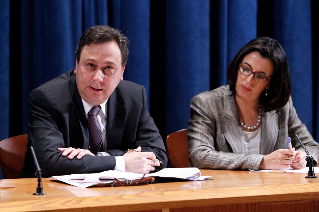 Roberto Marino (left), Special Representative of the Mexican Presidency for the G20, briefs journalists on preparations for the G20 Leaders’ Summit in mid-June, which will be hosted by Mexico in Los Cabos.