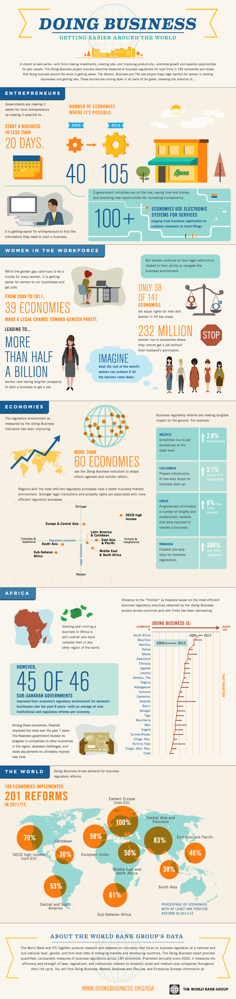 The World Bank released its 10th annual edition of Doing Business which shows the state of, in fact, doing business in 185 economies. On its ease of doing business index it is easiest to do business in Singapore followed by Hong Kong, New Zealand, United States, Denmark, Norway, and the UK. Some African countries made doing business easier such as Zimbabwe that reduced start-up fees and sped up name search in databases, for example. Zambia also reduced their required start-up capital amount and Mozambique simplified its licensing procedures. You can search by country if you’re interested in seeing how they have improved or reduced the ease of doing business. Poland is the most improved economy in the past year. Of African countries, Burundi was the most improved.