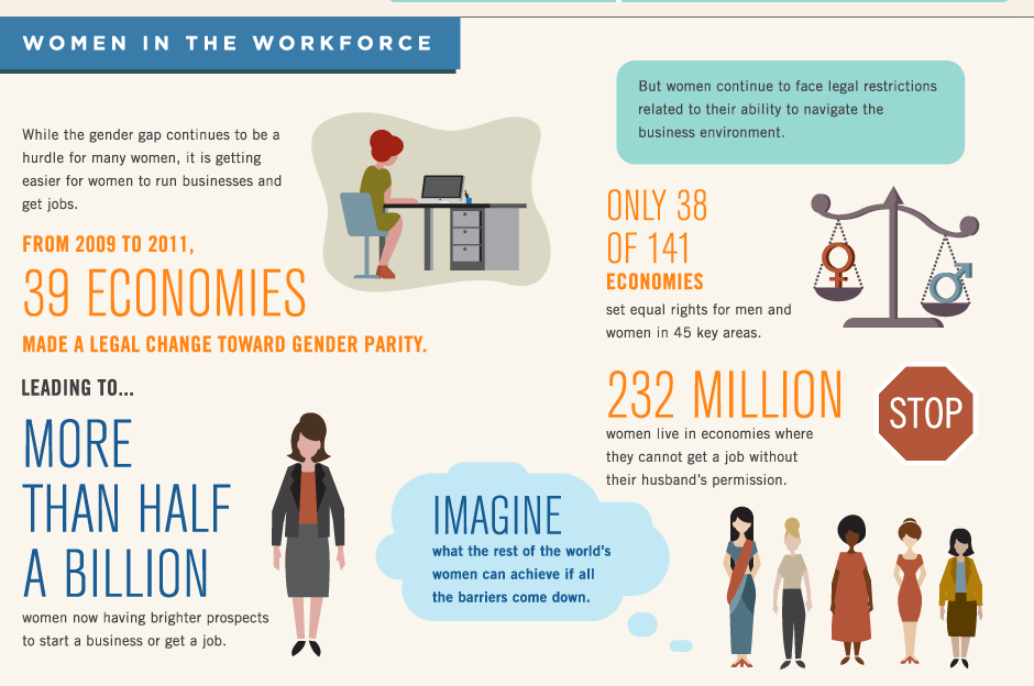 As far as women in business, 39 countries made a legal move toward gender equality and yet 232 million women still live in economies where they cannot start their own business without their husband’s permission. Legally women have equal rights with men in only 45 countries out of 141 economies.