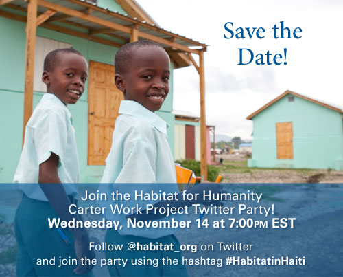 On November 14 at 7 PM EST we will moderate a Twitter conversation about the Jimmy and Rosalyn Carter Work Project in Haiti this year. The 29th annual Carter Work Project returns to Léogâne, Haiti, Nov. 23-Dec. 1, 2012, for the second year in a row.