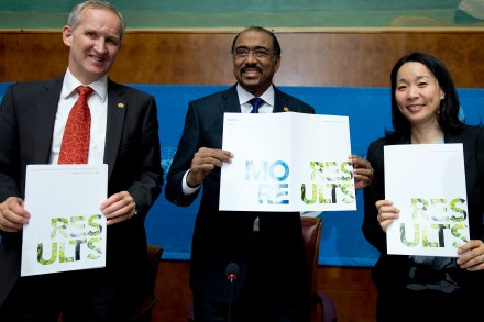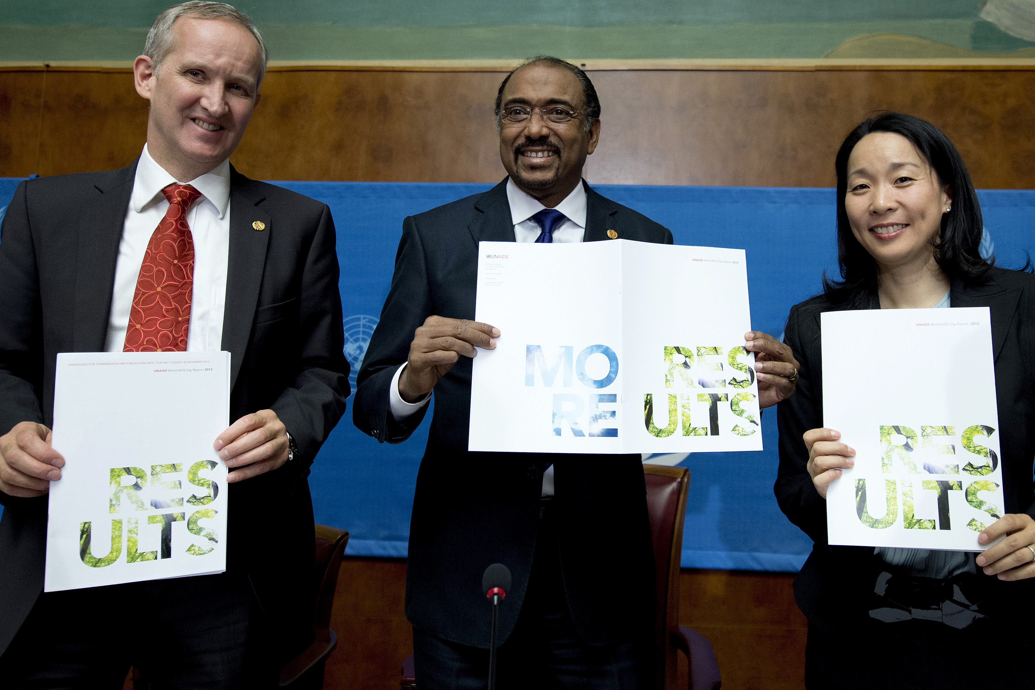 Michel Sidibé (centre), Executive Director of the Joint UN Programme on AIDS and HIV (UNAIDS), with Bernhard Schwartländer (left), Director for Evidence, Strategy and Results at UNAIDS, and Annemarie Hou (right), UNAIDS’ Director of Communications, holds up the organization’s new Results Report on HIV, launched during a press conference today in Geneva, Switzerland.