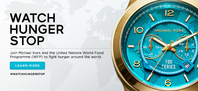 As a part of the global race to end hunger Michael Kors has partnered with the World Food Programme to help solve the crisis of 870 million people not having enough food to eat each day. Kors designed the 100 Series watch for the newly-launched Watch Hunger Stop campaign. Each sale of the 100 Series watch (retail $295) feeds 100 people through the World Food Programme.