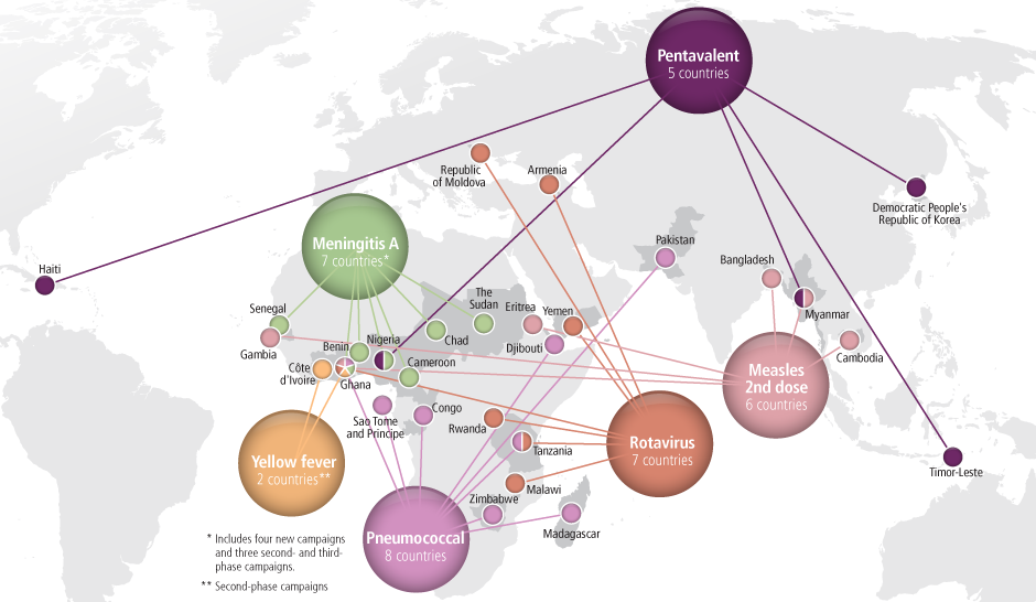 In 2012 you can see the graph of GAVI supported vaccine introductions. Click to enlarge. From the graph, the standout country in 2012 was Ghana which rolled out yellow fever, pnemococcal, rotavirus, measles 2nd dose, and meningitis A vaccines.