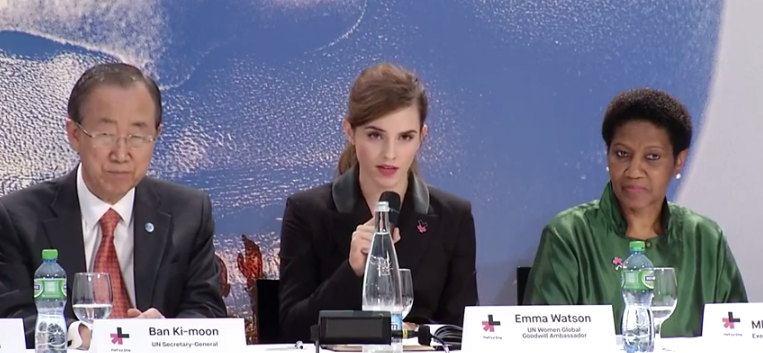 Now Watson is in Davos, Switzerland at the annual World Economic Forum where earlier today she delivered another speech at a press conference attended by UN Secretary-General Ban Ki-moon and Executive Director of UN Women Phumzile Mlambo-Ngcuka, launching the HeForShe IMPACT 10x10x10 initiative, a year-long pilot program that will elicit gender equality commitments from governments, corporations and universities. Through these commitments, the HeForShe IMPACT 10x10x10 program will evaluate these commitments to measure their scalability and effectiveness for gender equality.