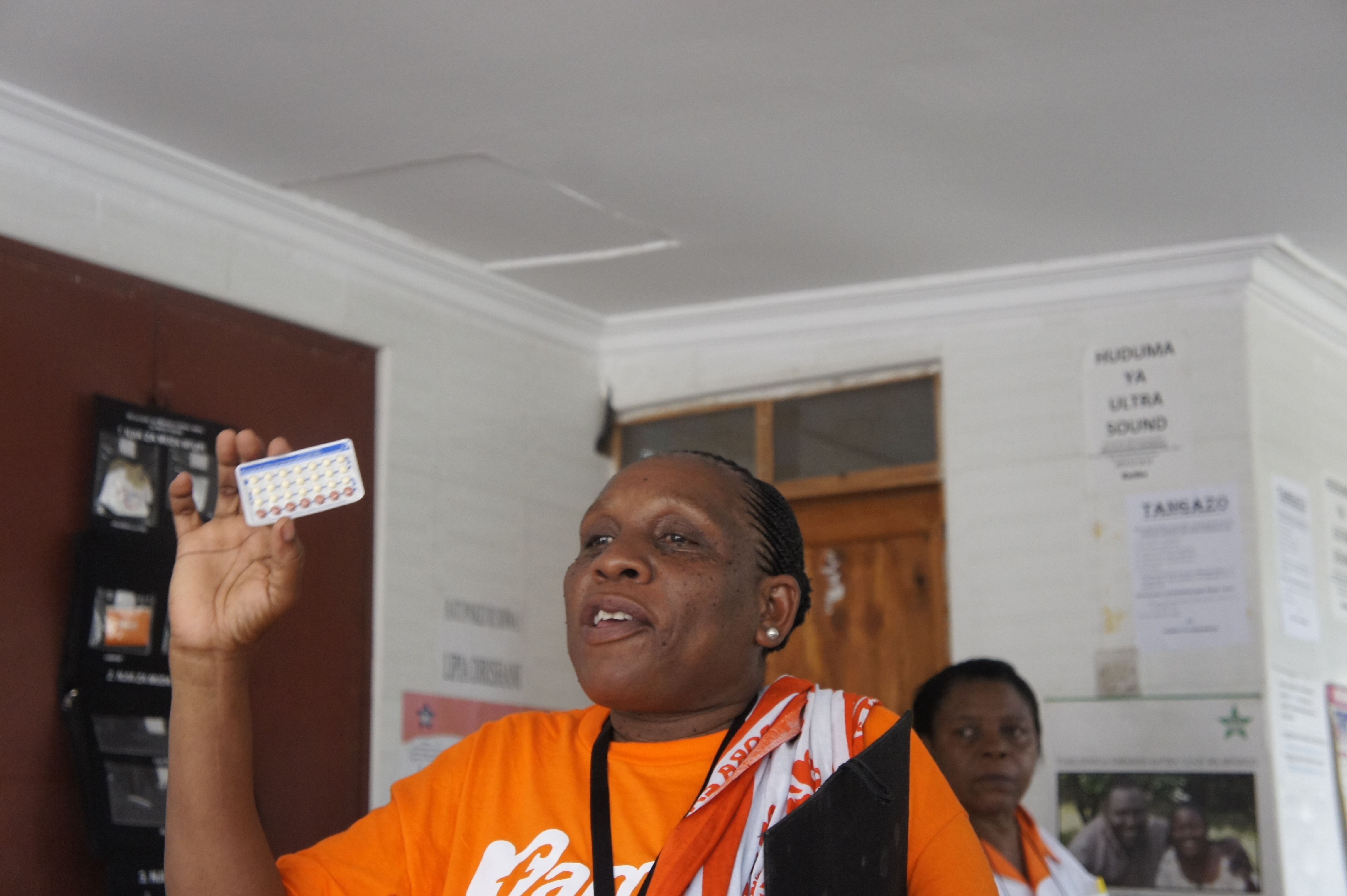 PSI trains health workers to teach women about contraceptives through its Familia network. Here a health worker named Mama Blandina teaches a packed room of new mothers about their contraceptive options.During Mama Blandina’s talk about contraceptives and family planning, she passes around samples for women to examine.PSI also uses dance groups to teach communities about family planning and contraceptive options. This dance group performed in Dar es Salaam in the fall of 2014.
