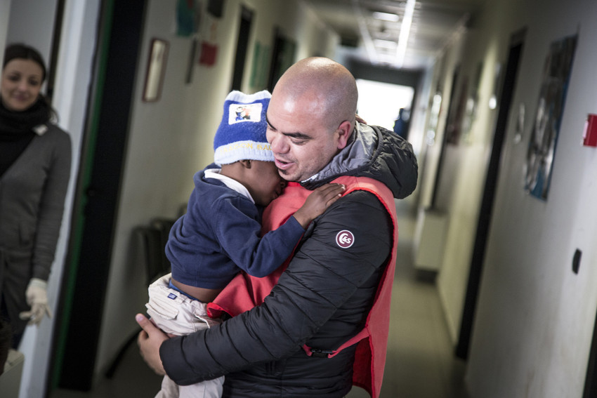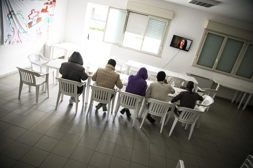 Ayo*, 4, child minor from Nigeria, plays with Save the Children’s cultural mediator, Naoufel Soussi, in one of the 32 reception facilities run by authorities around the country, accommodating children arriving to the coasts of Italy, fleeing conflict and poverty. At the time of our visit, there are approx. 40 children and also 19 families at the facility (this is an exception as usually facilities for unaccompanied children do not host families), of different nationalities. Most are Somali and Nigerian. Six to eight migrants live in each room. The facility is guarded by police 24/7. When new migrants arrive they are provided with a hygiene kit. Medical checks are to be provided but so far no psychosocial services have been provided. By law, children are not supposed to stay in a center like this for no more than 90 days, when they are to start a proper integration into Italian society, in a community that offers permanent housing and learning possibilities. Due to the sheer number of arrivals and an overburdened system, that is not always the case.