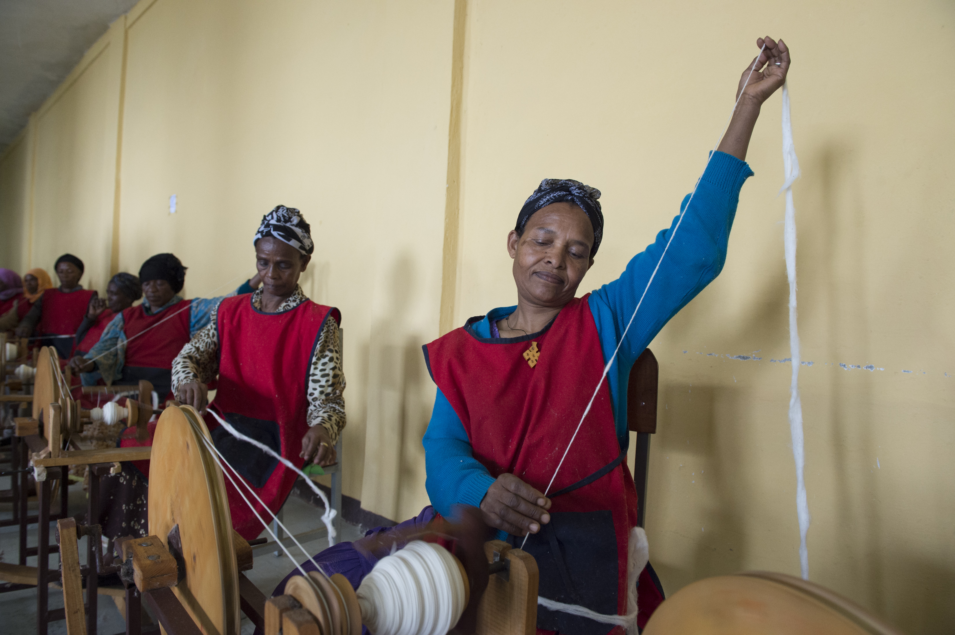 These trainees are at a project known as “Connecting 1,500 Women and Girls to the Export Market”. The project was created in 2014 by Ethiopia’s First Lady, Mrs. Roman Tesfaye and trains women and girls to develop skills in industries such as leather, weaving, basketry, embroidery, gemstones, and spinning and connect them to global markets to increase the trade of their goods.