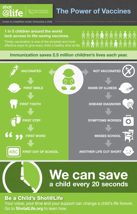 Shot@Life educates, connects and empowers Americans to champion vaccines as one of the most cost-effective ways to save the lives of children in developing countries. A national call to action for this global cause, the campaign rallies the American public, members of Congress, and civil society partners around the fact that together, we can save a child’s life every 20 seconds by expanding access to vaccines. By encouraging Americans to learn about, advocate for, and donate vaccines, the United Nations Foundation’s Shot@Life campaign will decrease vaccine-preventable childhood deaths and give children a shot at a healthy life. To learn more, go to ShotatLife.org.
